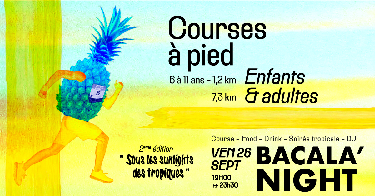 19H - Course enfants de 6 à 11 ans 7.3 km - 19H30 - Course solo de 13 à 99 ans "Sous les sunlights des tropiques..." Courses festives et solidaires suivies d'une soirée disco caraïbe (DJ) - Plats et cocktails d'été - Courses déguisées ou pas !