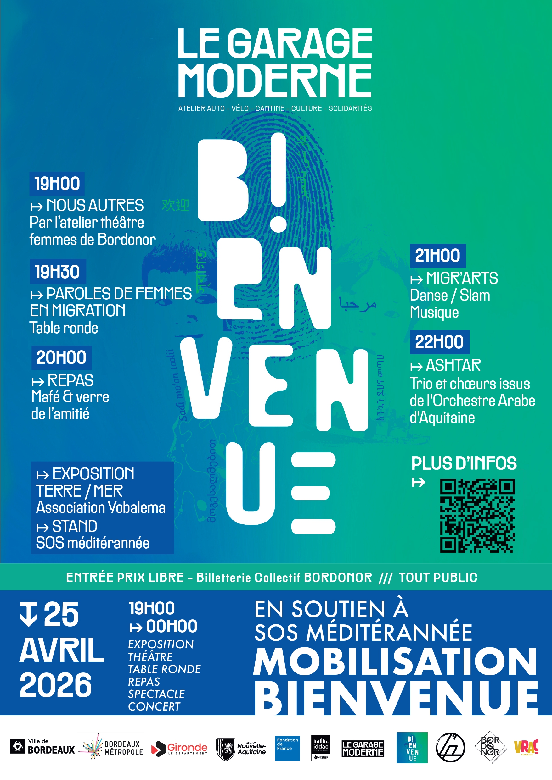 Le Collectif Bienvenue investit le Garage Moderne, en lien avec La Pangée et Bordonor, afin de proposer une soirée solidaire, festive et conviviale bourrée d'espoir.