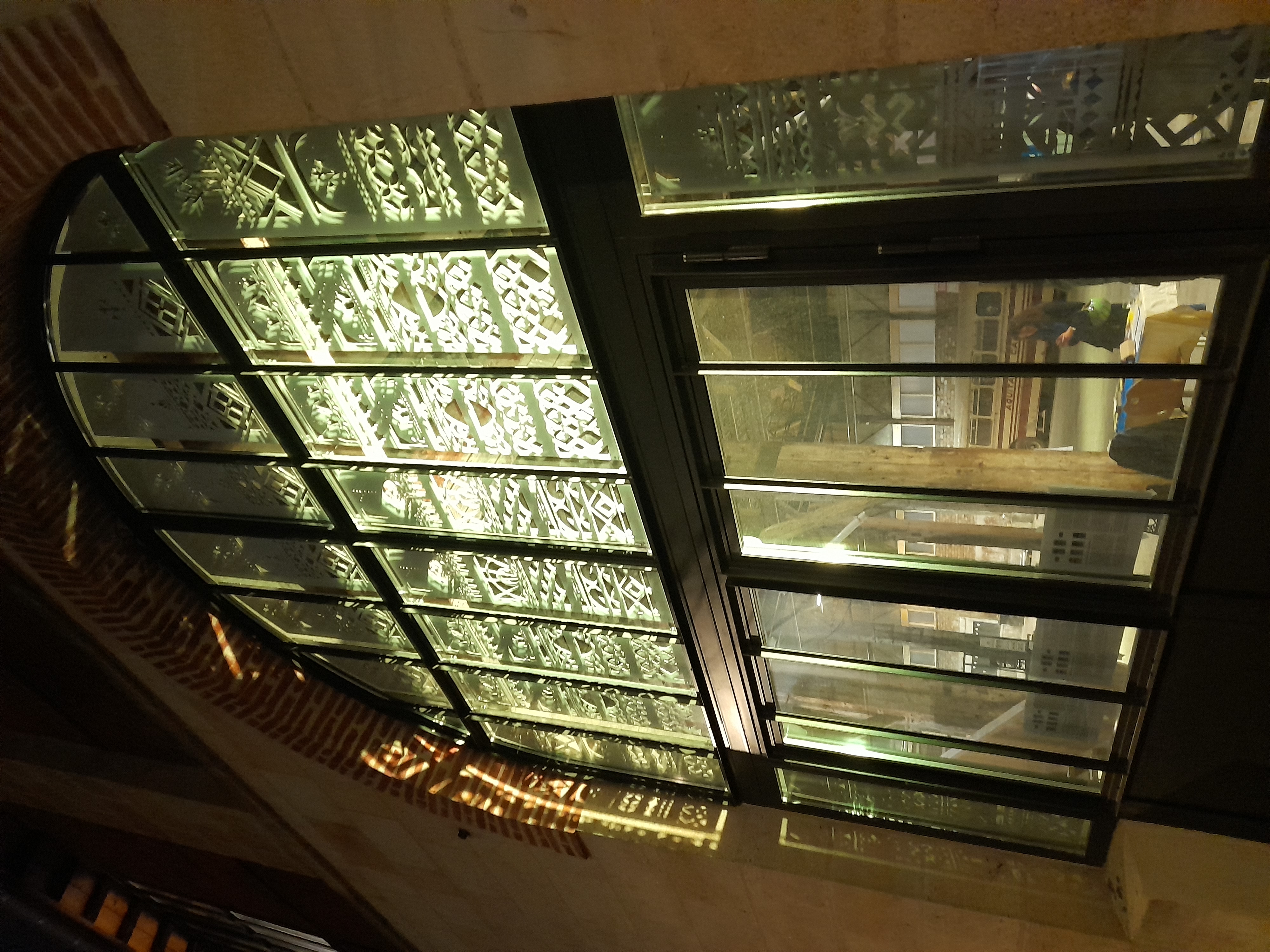 About the symbols. Viewers may focus on the central fragments, where each complete panel becomes its own story. The central arch is filled with an inner dynamism of repetitions, balanced by dominant static elements that create equilibrium between movement and protection.